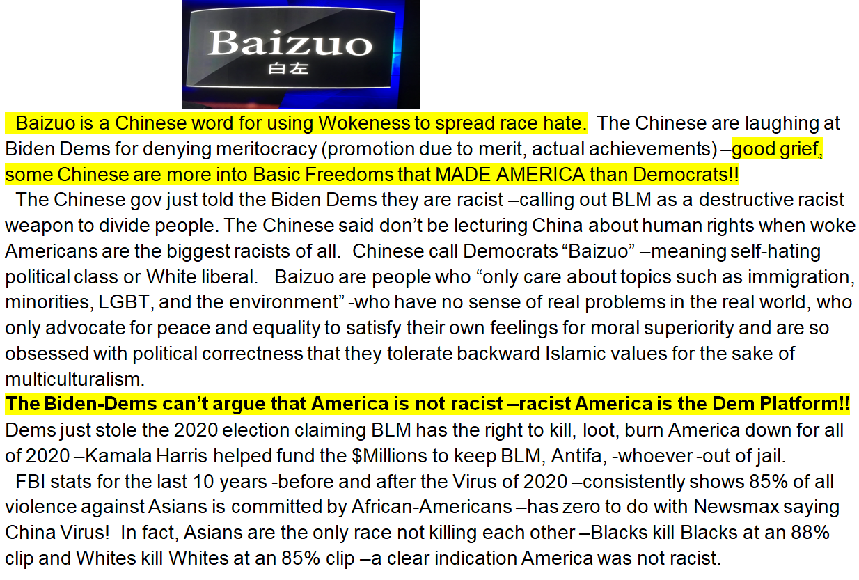 The Democrat CRT teaches kids to hate White People, Family, -that White People, Police, America, -are racist and must bow down to the rest of the world. CRT destroys all history of America –a complete re-writing of history. For a few days we had Pres Trump’s “1776 Commission” -which was deleted by the Biden EO. The Pres Trump 1776 Commission teaches kids to Love their Neighbor, Love America, and grow up with the idea that you will be judged on your Achievements, Heart, & Character –not by how you look. Which America do you want to live in?!