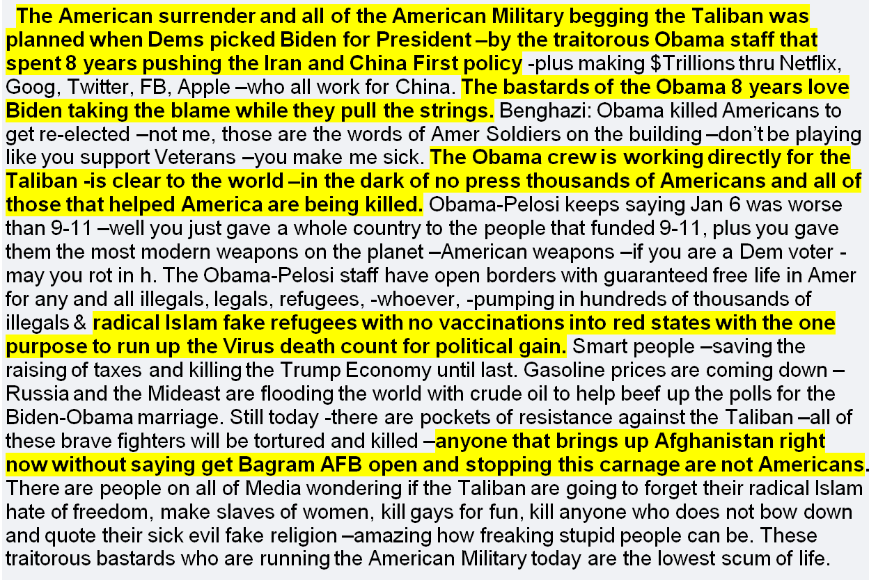 Obama-Pelosi keeps saying Jan 6 was worse than 9-11 –well you just gave a whole country to the people that funded 9-11, plus you gave them the most modern weapons on the planet –American weapons –if you are a Dem voter -may you rot in h.