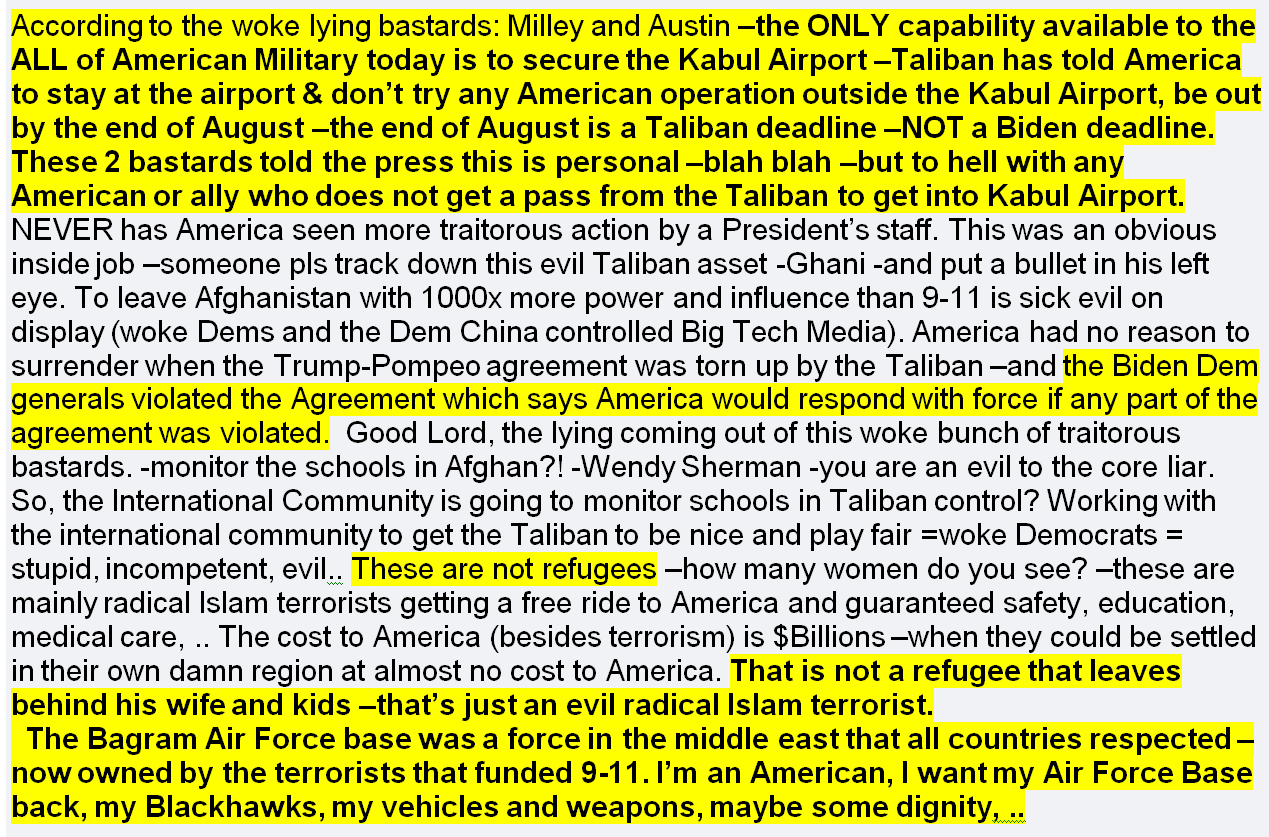 According to the woke lying bastards: Milley and Austin –the ONLY capability available to the ALL of American Military today is to secure the Kabul Airport –Taliban has told America to stay at the airport & don’t try any American operation outside the Kabul Airport, be out by the end of August –the end of August is a Taliban deadline –NOT a Biden deadline. These 2 bastards told the press this is personal –blah blah –but to hell with any American or ally who does not get a pass from the Taliban to get into Kabul Airport.    NEVER has America seen more traitorous action by a President’s staff.